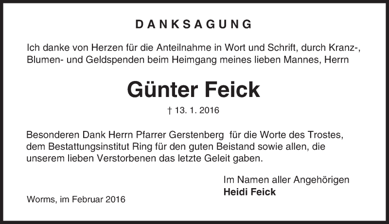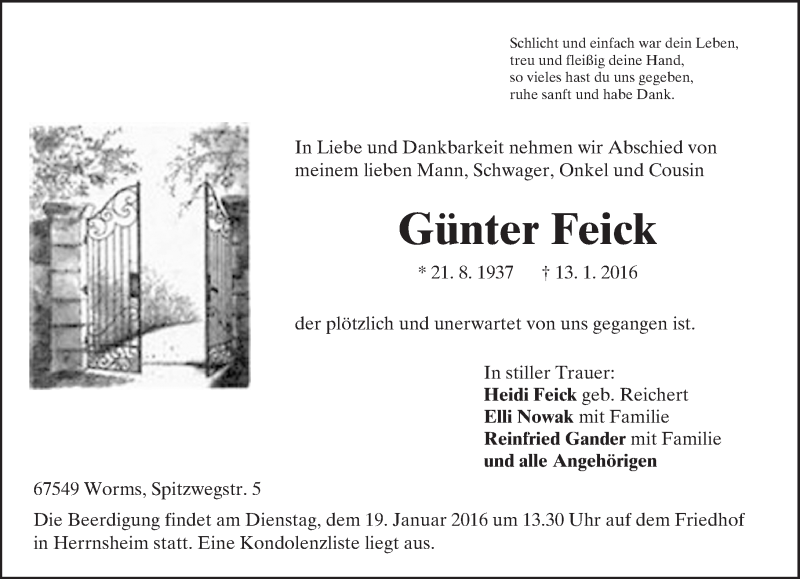 Hier finden Sie alle Traueranzeigen aus der Zeitung, die bisher für Günter Feick erschienen sind. Weitere Traueranzeigen, die in der Zeitung erscheinen, werden hier ebenfalls aufgelistet