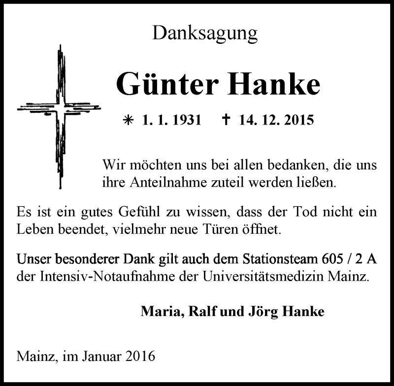 Hier finden Sie alle Traueranzeigen aus der Zeitung, die bisher für Günter Hanke erschienen sind. Weitere Traueranzeigen, die in der Zeitung erscheinen, werden hier ebenfalls aufgelistet