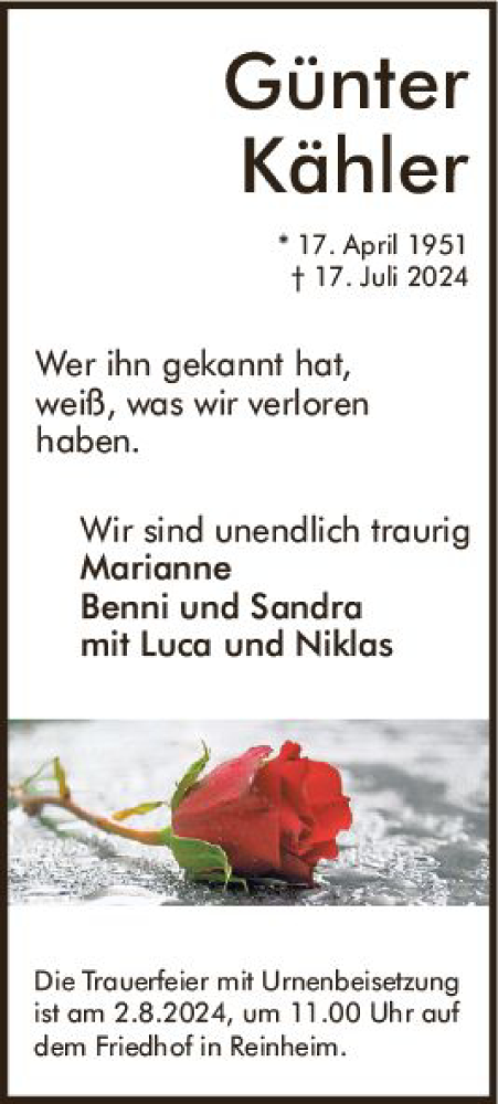 Hier finden Sie alle Traueranzeigen aus der Zeitung, die bisher für Günter Kähler erschienen sind. Weitere Traueranzeigen, die in der Zeitung erscheinen, werden hier ebenfalls aufgelistet