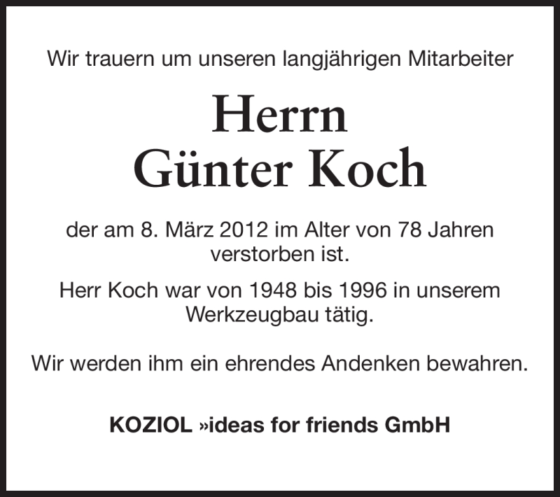 Hier finden Sie alle Traueranzeigen aus der Zeitung, die bisher für Günter Koch erschienen sind. Weitere Traueranzeigen, die in der Zeitung erscheinen, werden hier ebenfalls aufgelistet