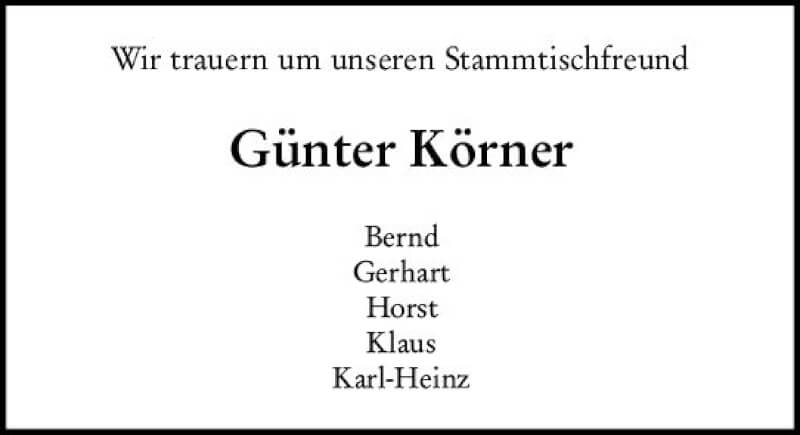 Hier finden Sie alle Traueranzeigen aus der Zeitung, die bisher für Günter Körner erschienen sind. Weitere Traueranzeigen, die in der Zeitung erscheinen, werden hier ebenfalls aufgelistet