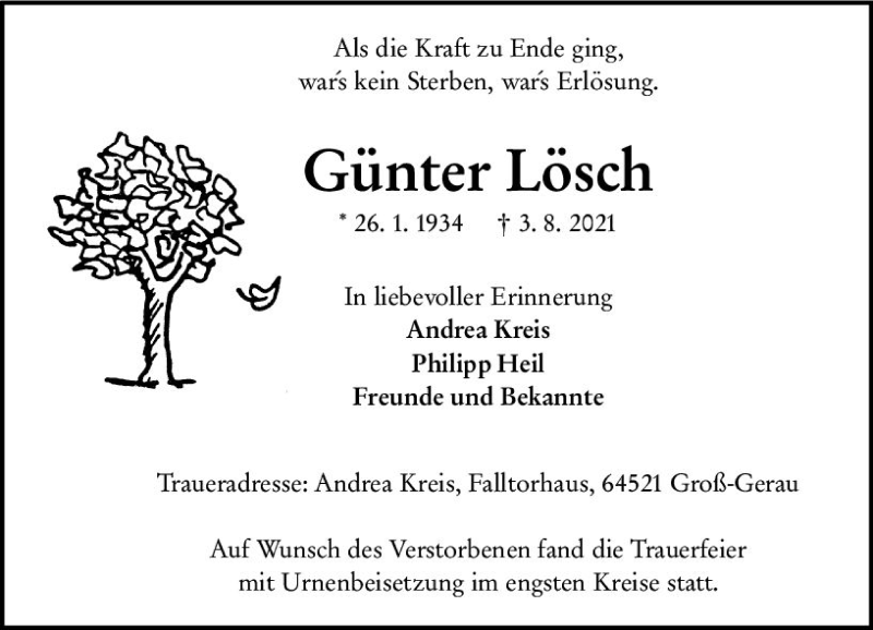 Hier finden Sie alle Traueranzeigen aus der Zeitung, die bisher für Günter Lösch erschienen sind. Weitere Traueranzeigen, die in der Zeitung erscheinen, werden hier ebenfalls aufgelistet