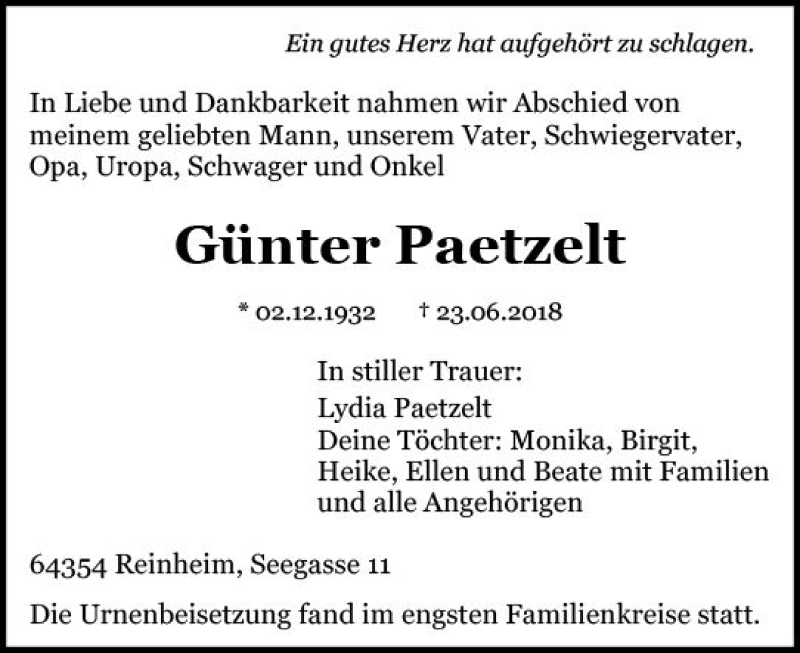 Hier finden Sie alle Traueranzeigen aus der Zeitung, die bisher für Günter Paetzelt erschienen sind. Weitere Traueranzeigen, die in der Zeitung erscheinen, werden hier ebenfalls aufgelistet