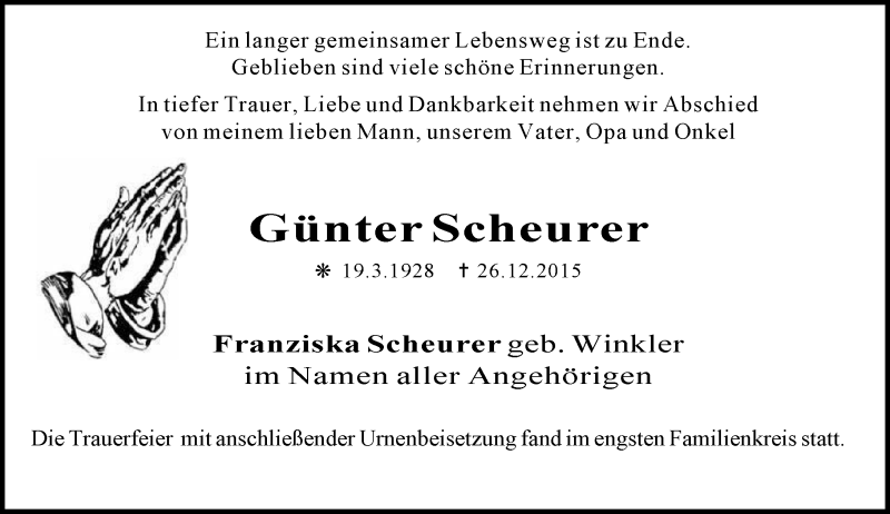 Hier finden Sie alle Traueranzeigen aus der Zeitung, die bisher für Günter Scheurer erschienen sind. Weitere Traueranzeigen, die in der Zeitung erscheinen, werden hier ebenfalls aufgelistet