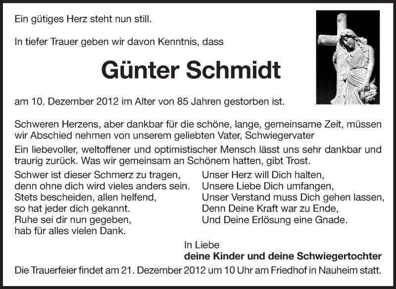 Hier finden Sie alle Traueranzeigen aus der Zeitung, die bisher für Günter Schmidt erschienen sind. Weitere Traueranzeigen, die in der Zeitung erscheinen, werden hier ebenfalls aufgelistet