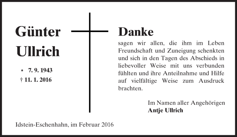 Hier finden Sie alle Traueranzeigen aus der Zeitung, die bisher für Günter Ullrich erschienen sind. Weitere Traueranzeigen, die in der Zeitung erscheinen, werden hier ebenfalls aufgelistet