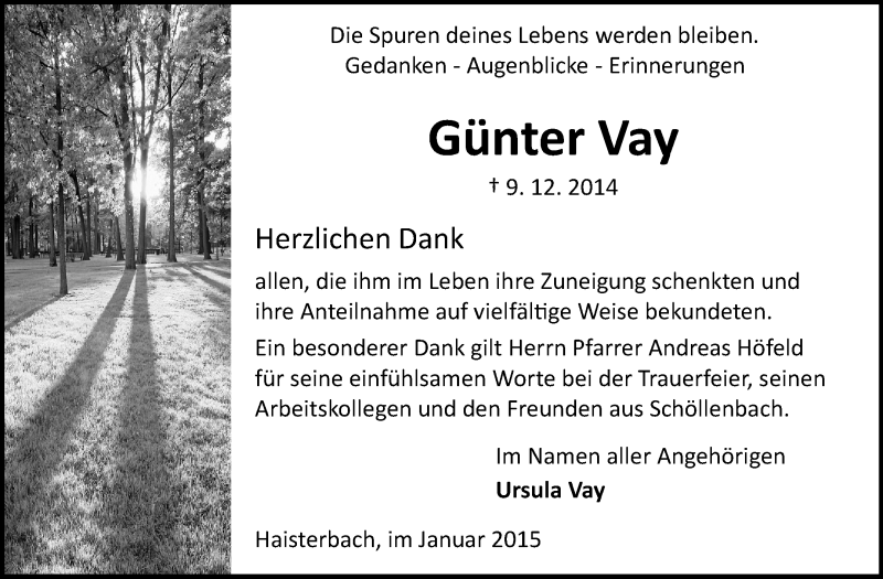 Hier finden Sie alle Traueranzeigen aus der Zeitung, die bisher für Günter Vay erschienen sind. Weitere Traueranzeigen, die in der Zeitung erscheinen, werden hier ebenfalls aufgelistet