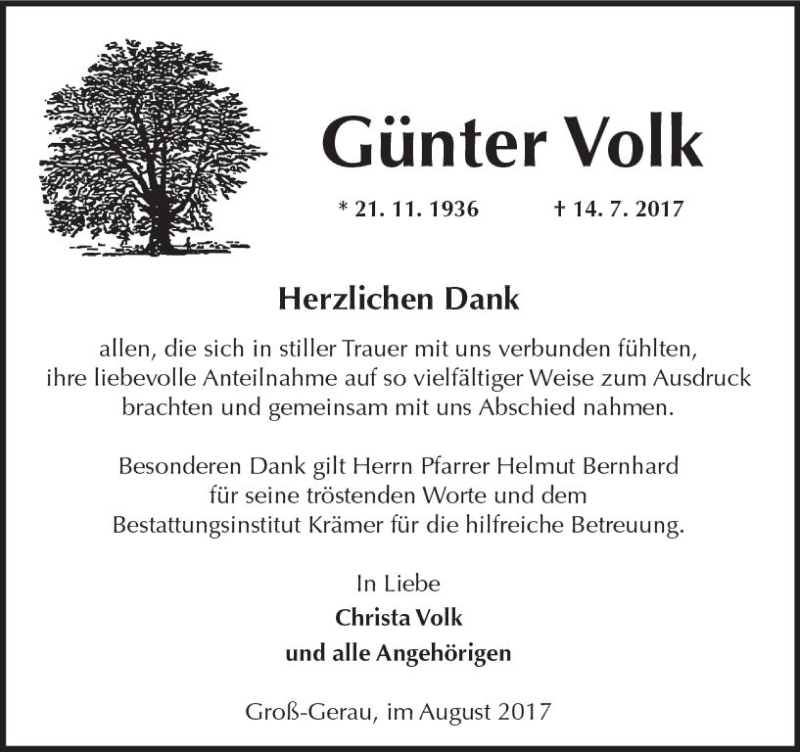 Hier finden Sie alle Traueranzeigen aus der Zeitung, die bisher für Günter Volk erschienen sind. Weitere Traueranzeigen, die in der Zeitung erscheinen, werden hier ebenfalls aufgelistet