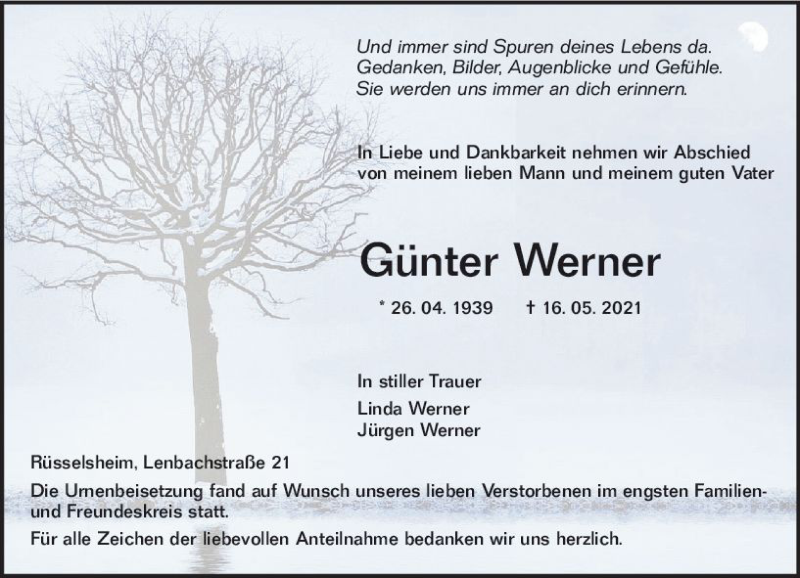 Hier finden Sie alle Traueranzeigen aus der Zeitung, die bisher für Günter Werner erschienen sind. Weitere Traueranzeigen, die in der Zeitung erscheinen, werden hier ebenfalls aufgelistet