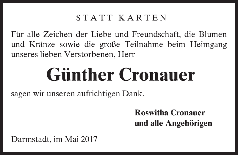 Hier finden Sie alle Traueranzeigen aus der Zeitung, die bisher für Günther Cronauer erschienen sind. Weitere Traueranzeigen, die in der Zeitung erscheinen, werden hier ebenfalls aufgelistet