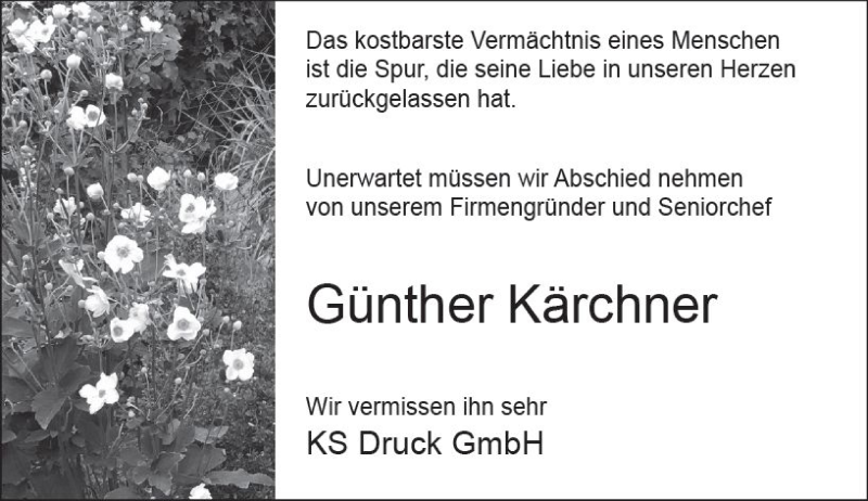 Hier finden Sie alle Traueranzeigen aus der Zeitung, die bisher für Günther Kärchner erschienen sind. Weitere Traueranzeigen, die in der Zeitung erscheinen, werden hier ebenfalls aufgelistet