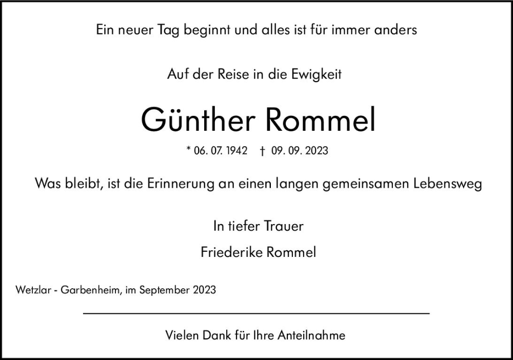 Hier finden Sie alle Traueranzeigen aus der Zeitung, die bisher für Günther Rommel erschienen sind. Weitere Traueranzeigen, die in der Zeitung erscheinen, werden hier ebenfalls aufgelistet