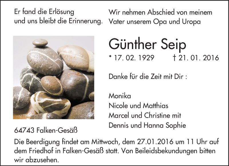 Hier finden Sie alle Traueranzeigen aus der Zeitung, die bisher für Günther Seip erschienen sind. Weitere Traueranzeigen, die in der Zeitung erscheinen, werden hier ebenfalls aufgelistet