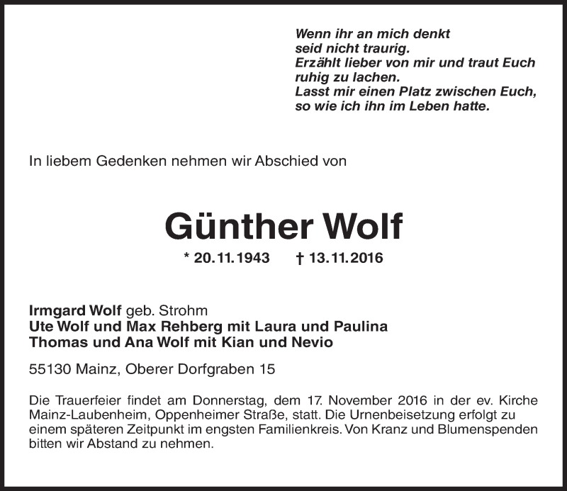 Hier finden Sie alle Traueranzeigen aus der Zeitung, die bisher für Günther Wolf erschienen sind. Weitere Traueranzeigen, die in der Zeitung erscheinen, werden hier ebenfalls aufgelistet