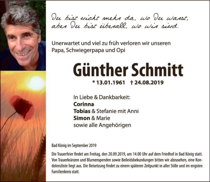 Hier finden Sie alle Traueranzeigen aus der Zeitung, die bisher für Günther Schmitt erschienen sind. Weitere Traueranzeigen, die in der Zeitung erscheinen, werden hier ebenfalls aufgelistet