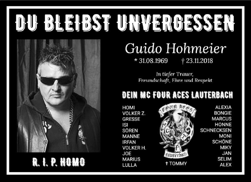 Hier finden Sie alle Traueranzeigen aus der Zeitung, die bisher für Guido Hohmeier erschienen sind. Weitere Traueranzeigen, die in der Zeitung erscheinen, werden hier ebenfalls aufgelistet