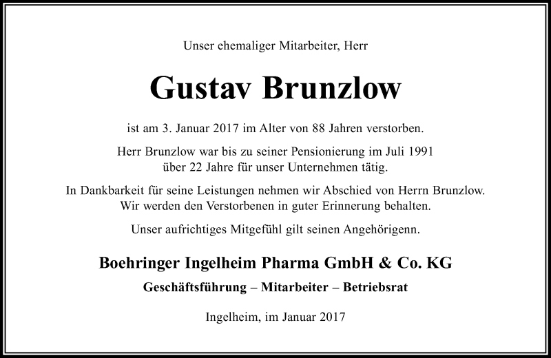 Hier finden Sie alle Traueranzeigen aus der Zeitung, die bisher für Gustav Brunzlow erschienen sind. Weitere Traueranzeigen, die in der Zeitung erscheinen, werden hier ebenfalls aufgelistet
