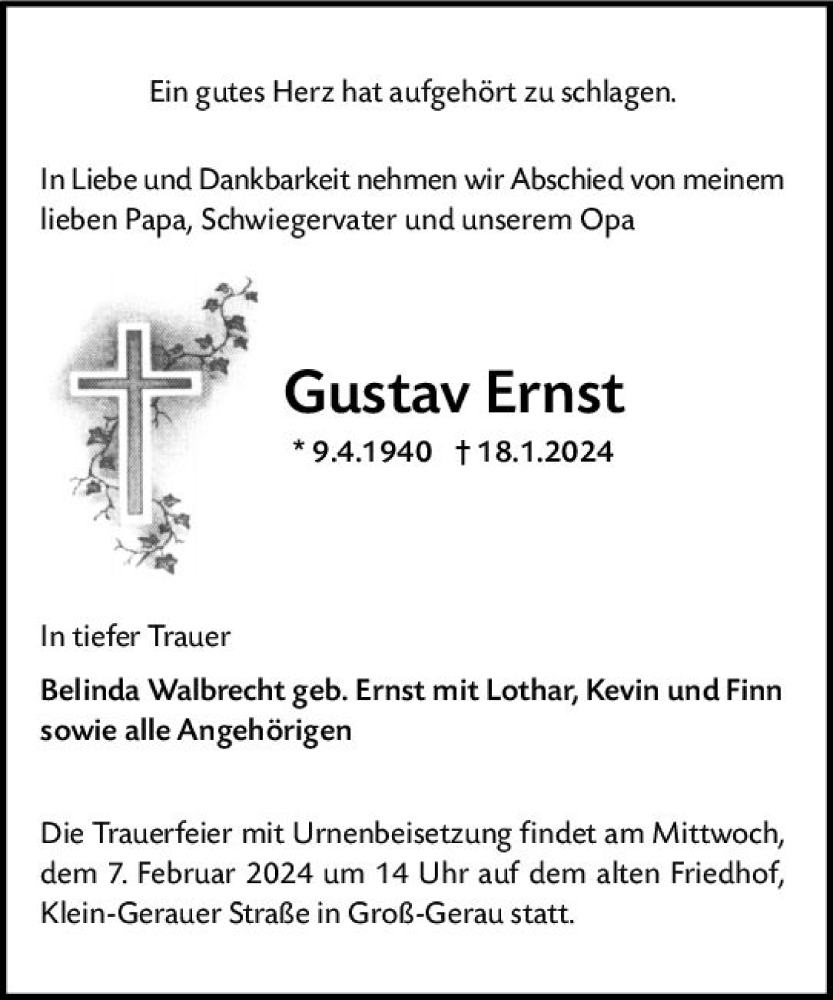 Hier finden Sie alle Traueranzeigen aus der Zeitung, die bisher für Gustav Ernst erschienen sind. Weitere Traueranzeigen, die in der Zeitung erscheinen, werden hier ebenfalls aufgelistet