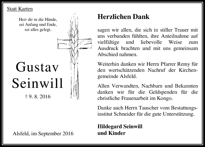 Hier finden Sie alle Traueranzeigen aus der Zeitung, die bisher für Gustav Seinwill erschienen sind. Weitere Traueranzeigen, die in der Zeitung erscheinen, werden hier ebenfalls aufgelistet