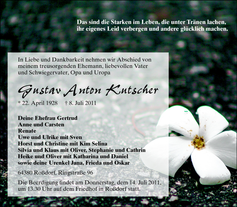 Hier finden Sie alle Traueranzeigen aus der Zeitung, die bisher für Gustav Anton Kutscher erschienen sind. Weitere Traueranzeigen, die in der Zeitung erscheinen, werden hier ebenfalls aufgelistet