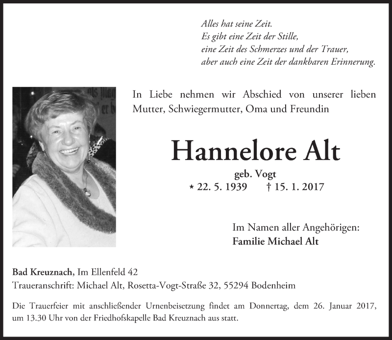 Hier finden Sie alle Traueranzeigen aus der Zeitung, die bisher für Hannelore Alt erschienen sind. Weitere Traueranzeigen, die in der Zeitung erscheinen, werden hier ebenfalls aufgelistet