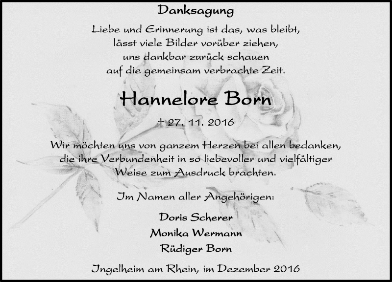Hier finden Sie alle Traueranzeigen aus der Zeitung, die bisher für Hannelore Born erschienen sind. Weitere Traueranzeigen, die in der Zeitung erscheinen, werden hier ebenfalls aufgelistet