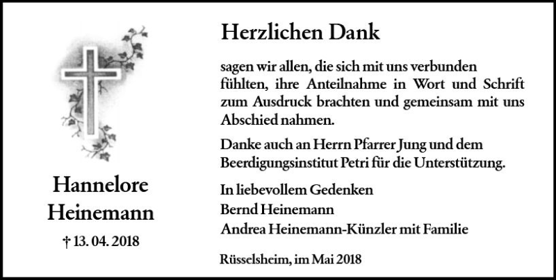 Hier finden Sie alle Traueranzeigen aus der Zeitung, die bisher für Hannelore Heinemann erschienen sind. Weitere Traueranzeigen, die in der Zeitung erscheinen, werden hier ebenfalls aufgelistet
