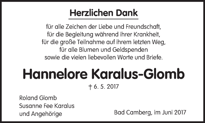 Hier finden Sie alle Traueranzeigen aus der Zeitung, die bisher für Hannelore Karalus-Glomb erschienen sind. Weitere Traueranzeigen, die in der Zeitung erscheinen, werden hier ebenfalls aufgelistet
