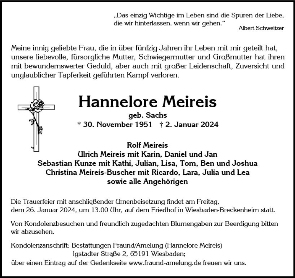 Hier finden Sie alle Traueranzeigen aus der Zeitung, die bisher für Hannelore Meireis erschienen sind. Weitere Traueranzeigen, die in der Zeitung erscheinen, werden hier ebenfalls aufgelistet