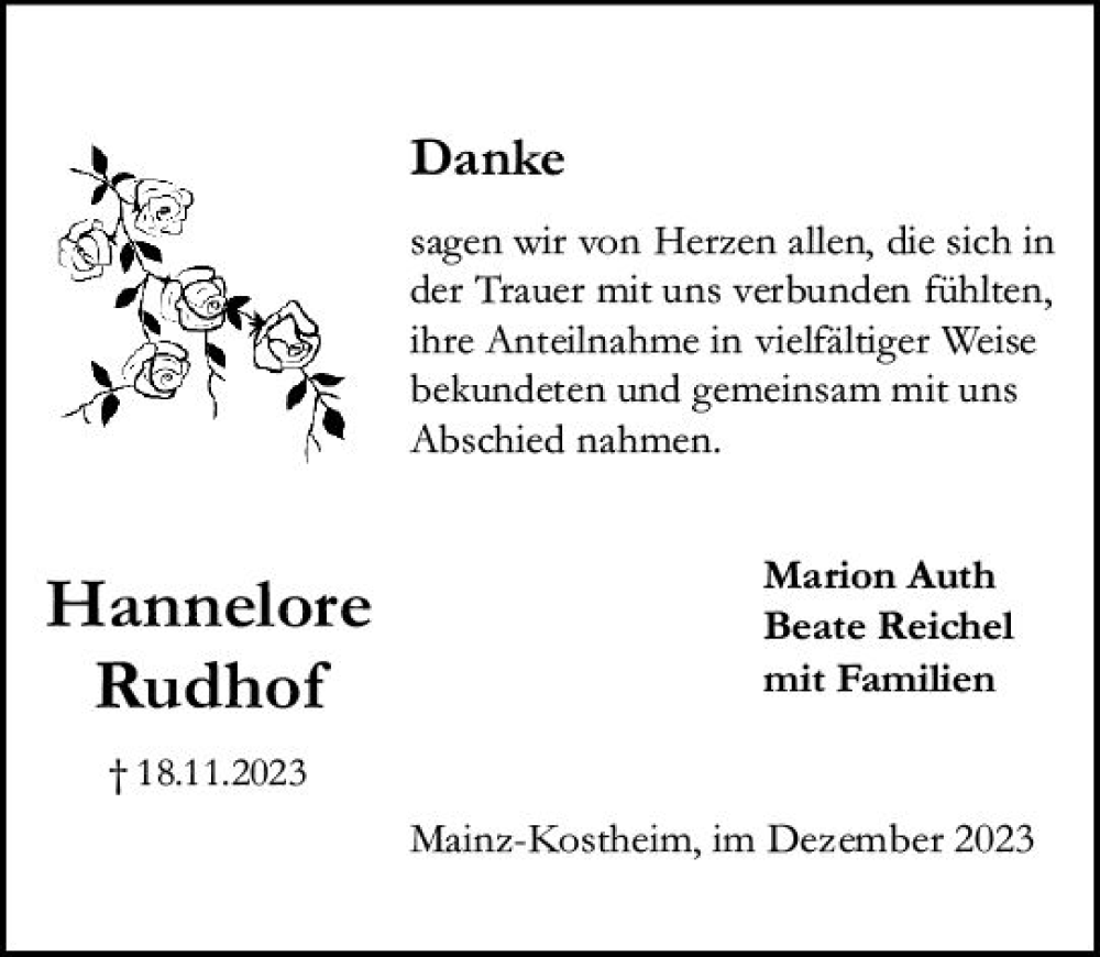 Hier finden Sie alle Traueranzeigen aus der Zeitung, die bisher für Hannelore Rudhof erschienen sind. Weitere Traueranzeigen, die in der Zeitung erscheinen, werden hier ebenfalls aufgelistet