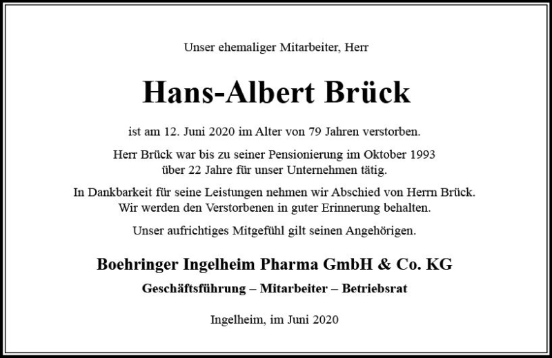 Hier finden Sie alle Traueranzeigen aus der Zeitung, die bisher für Hans-Albert Brück erschienen sind. Weitere Traueranzeigen, die in der Zeitung erscheinen, werden hier ebenfalls aufgelistet