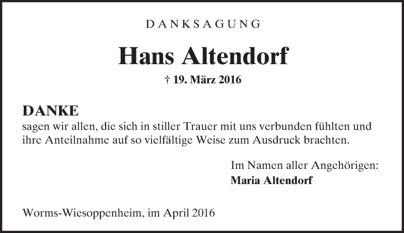 Hier finden Sie alle Traueranzeigen aus der Zeitung, die bisher für Hans Altendorf erschienen sind. Weitere Traueranzeigen, die in der Zeitung erscheinen, werden hier ebenfalls aufgelistet