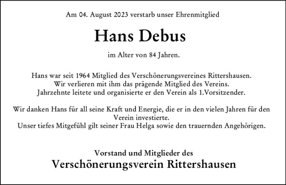 Hier finden Sie alle Traueranzeigen aus der Zeitung, die bisher für Hans Debus erschienen sind. Weitere Traueranzeigen, die in der Zeitung erscheinen, werden hier ebenfalls aufgelistet