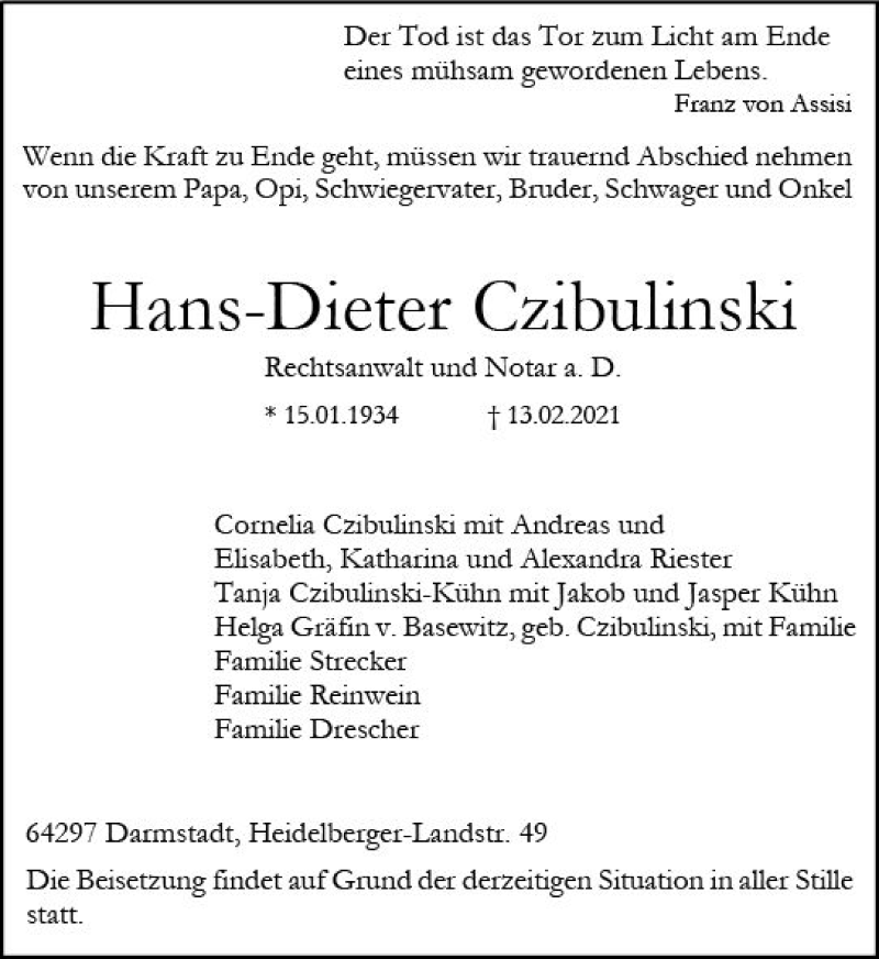 Hier finden Sie alle Traueranzeigen aus der Zeitung, die bisher für Hans-Dieter Czibulinski erschienen sind. Weitere Traueranzeigen, die in der Zeitung erscheinen, werden hier ebenfalls aufgelistet