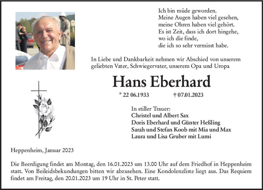 Hier finden Sie alle Traueranzeigen aus der Zeitung, die bisher für Hans Eberhard erschienen sind. Weitere Traueranzeigen, die in der Zeitung erscheinen, werden hier ebenfalls aufgelistet