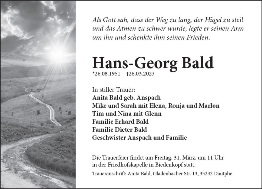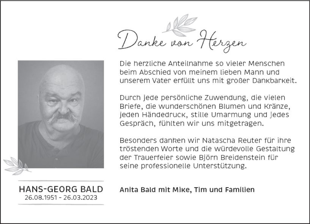 Hier finden Sie alle Traueranzeigen aus der Zeitung, die bisher für Hans-Georg Bald erschienen sind. Weitere Traueranzeigen, die in der Zeitung erscheinen, werden hier ebenfalls aufgelistet