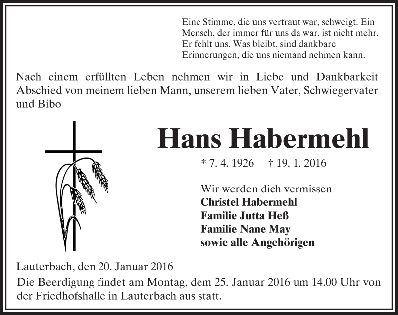 Hier finden Sie alle Traueranzeigen aus der Zeitung, die bisher für Hans Habermehl erschienen sind. Weitere Traueranzeigen, die in der Zeitung erscheinen, werden hier ebenfalls aufgelistet