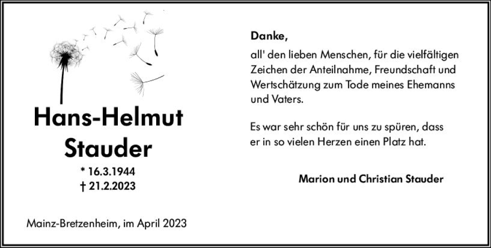 Hier finden Sie alle Traueranzeigen aus der Zeitung, die bisher für Hans-Helmut Stauder erschienen sind. Weitere Traueranzeigen, die in der Zeitung erscheinen, werden hier ebenfalls aufgelistet