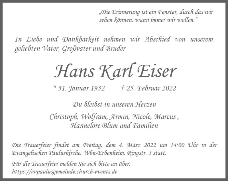 Hier finden Sie alle Traueranzeigen aus der Zeitung, die bisher für Hans Karl Eiser erschienen sind. Weitere Traueranzeigen, die in der Zeitung erscheinen, werden hier ebenfalls aufgelistet