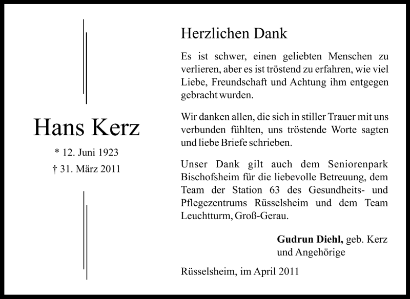 Hier finden Sie alle Traueranzeigen aus der Zeitung, die bisher für Hans Kerz erschienen sind. Weitere Traueranzeigen, die in der Zeitung erscheinen, werden hier ebenfalls aufgelistet