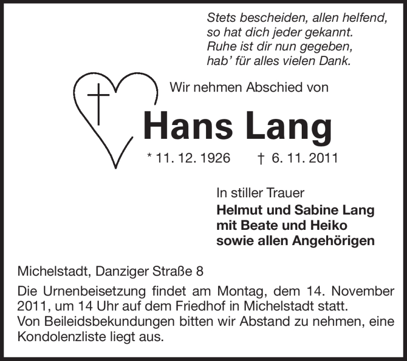 Hier finden Sie alle Traueranzeigen aus der Zeitung, die bisher für Hans Lang erschienen sind. Weitere Traueranzeigen, die in der Zeitung erscheinen, werden hier ebenfalls aufgelistet