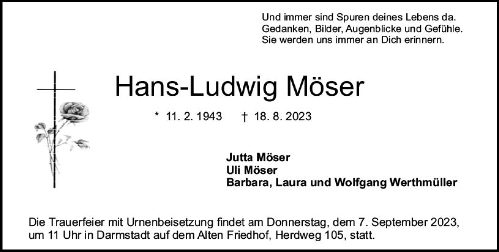 Hier finden Sie alle Traueranzeigen aus der Zeitung, die bisher für Hans-Ludwig Möser erschienen sind. Weitere Traueranzeigen, die in der Zeitung erscheinen, werden hier ebenfalls aufgelistet