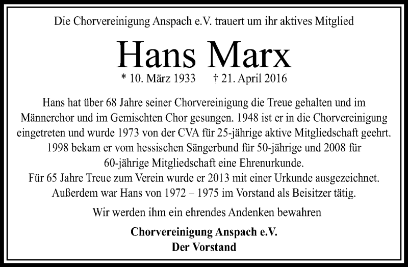 Hier finden Sie alle Traueranzeigen aus der Zeitung, die bisher für Hans Marx erschienen sind. Weitere Traueranzeigen, die in der Zeitung erscheinen, werden hier ebenfalls aufgelistet
