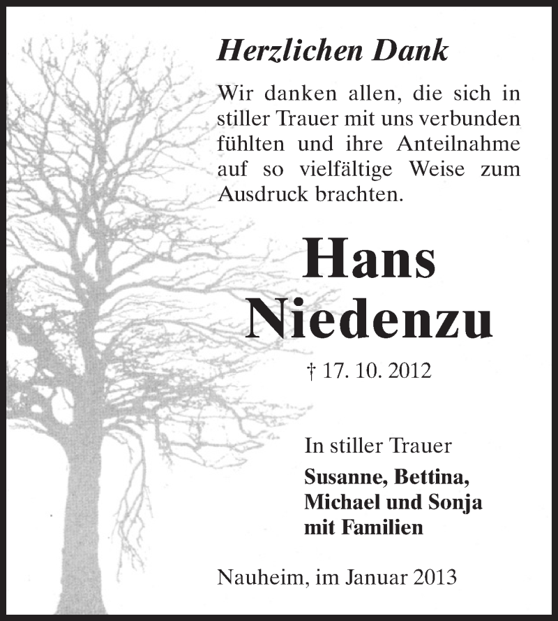 Hier finden Sie alle Traueranzeigen aus der Zeitung, die bisher für Hans Niedenzu erschienen sind. Weitere Traueranzeigen, die in der Zeitung erscheinen, werden hier ebenfalls aufgelistet