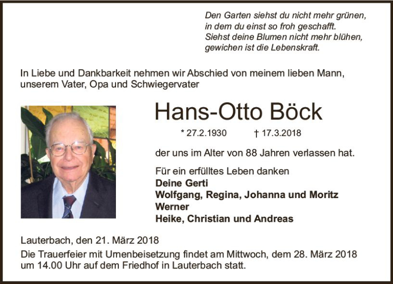 Hier finden Sie alle Traueranzeigen aus der Zeitung, die bisher für Hans-Otto Böck erschienen sind. Weitere Traueranzeigen, die in der Zeitung erscheinen, werden hier ebenfalls aufgelistet