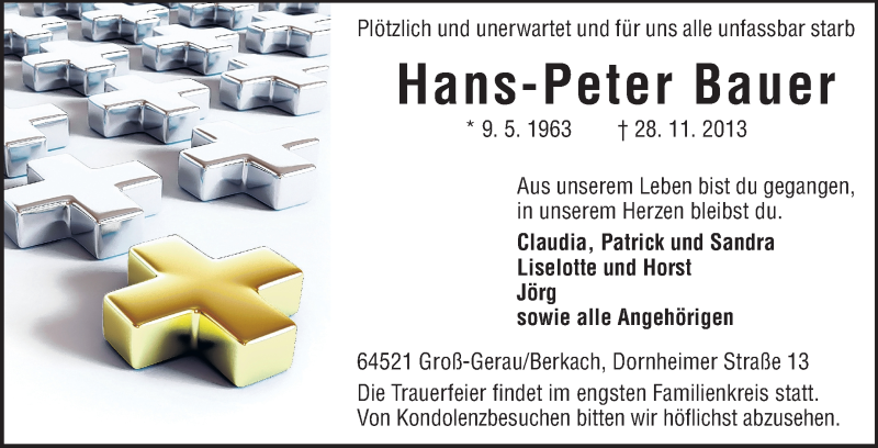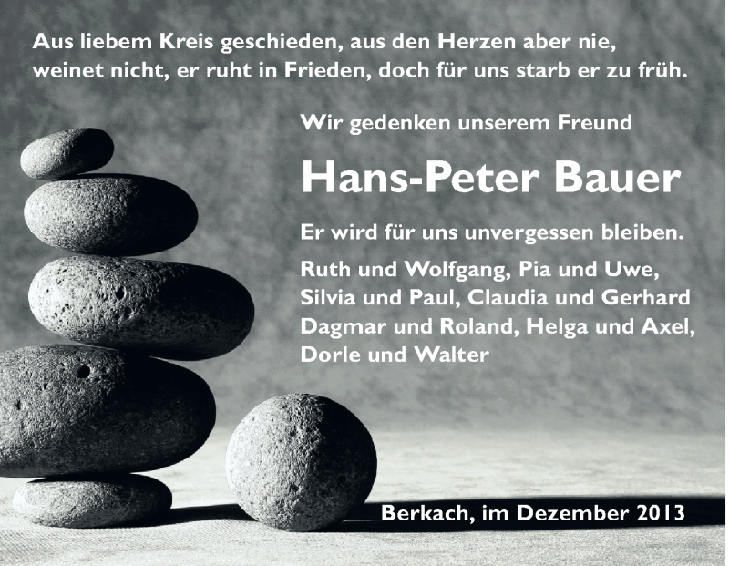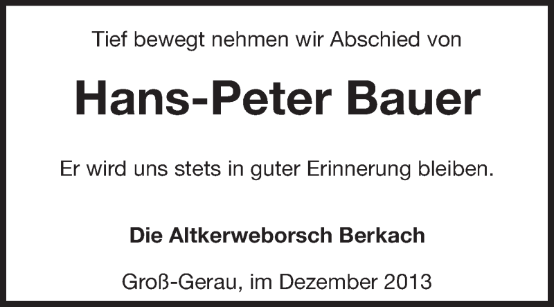 Hier finden Sie alle Traueranzeigen aus der Zeitung, die bisher für Hans-Peter Bauer erschienen sind. Weitere Traueranzeigen, die in der Zeitung erscheinen, werden hier ebenfalls aufgelistet