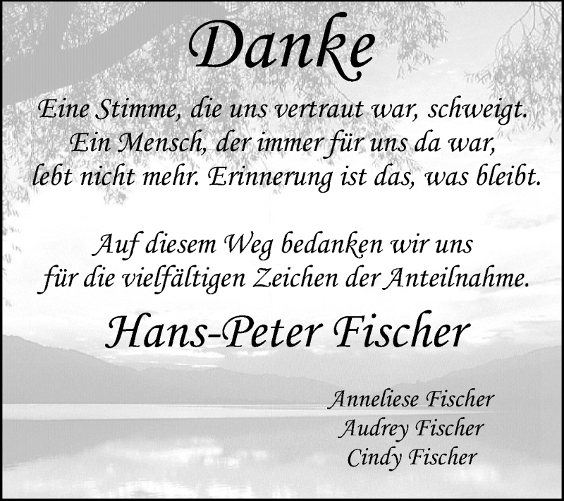 Hier finden Sie alle Traueranzeigen aus der Zeitung, die bisher für Hans-Peter Fischer erschienen sind. Weitere Traueranzeigen, die in der Zeitung erscheinen, werden hier ebenfalls aufgelistet