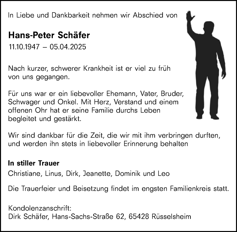 Hier finden Sie alle Traueranzeigen aus der Zeitung, die bisher für Hans-Peter Schäfer erschienen sind. Weitere Traueranzeigen, die in der Zeitung erscheinen, werden hier ebenfalls aufgelistet