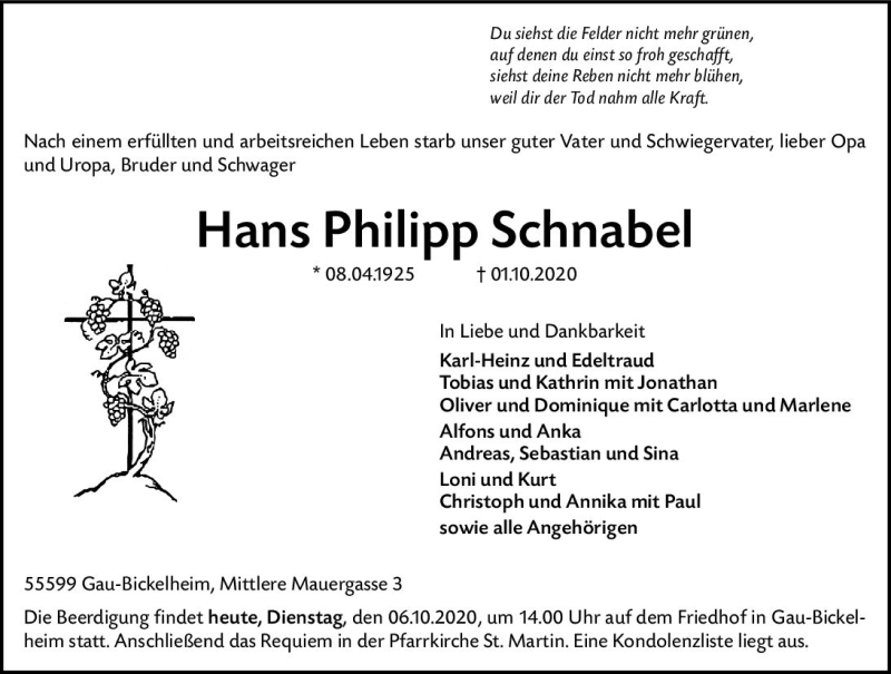 Hier finden Sie alle Traueranzeigen aus der Zeitung, die bisher für Hans Philipp Schnabel erschienen sind. Weitere Traueranzeigen, die in der Zeitung erscheinen, werden hier ebenfalls aufgelistet