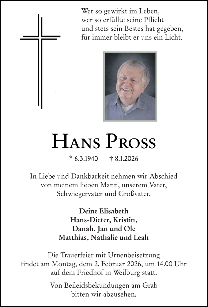 Hier finden Sie alle Traueranzeigen aus der Zeitung, die bisher für Hans Pross erschienen sind. Weitere Traueranzeigen, die in der Zeitung erscheinen, werden hier ebenfalls aufgelistet